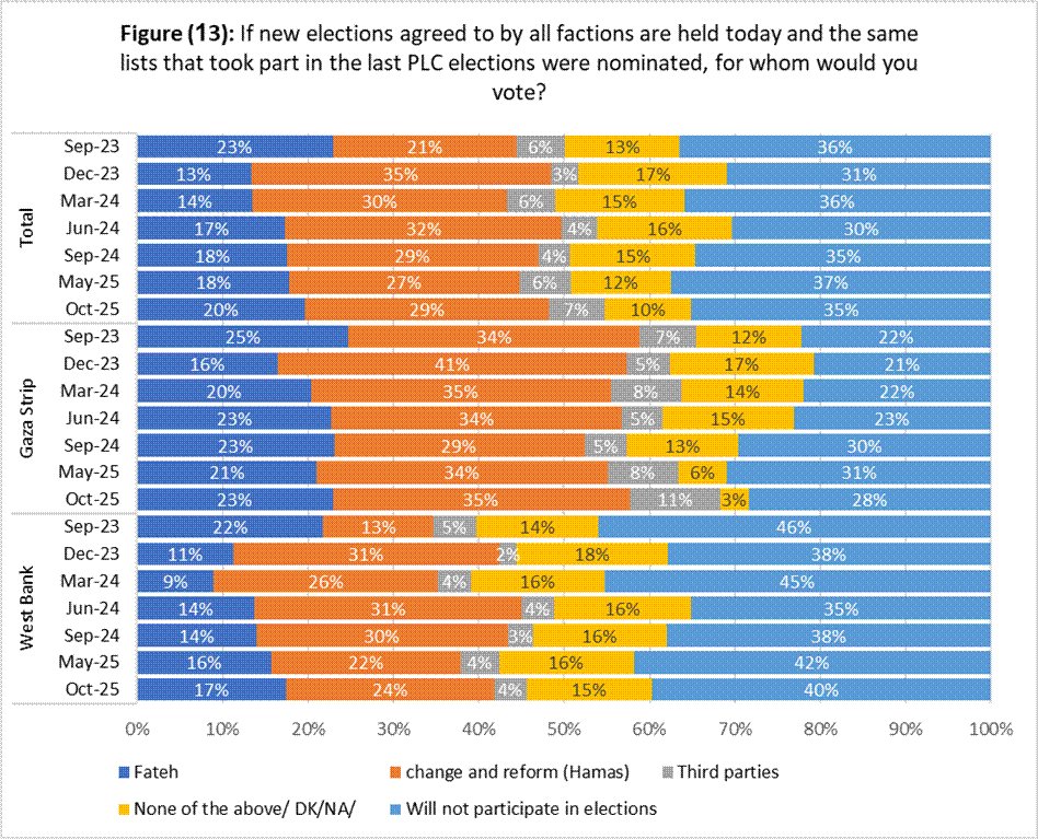 Meningsmålingen viser at blev der afholdt valg nu til palæstinensernes lovgivende forsamling med deltagelse af alle politiske partier, ville 44% stemme på Hamas, 30% på Fatah, 10% på andre partier mens 16% er i tvivl om, hvem de vil stemme på.