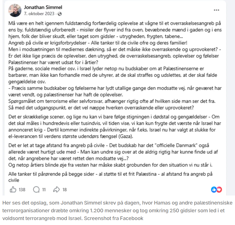 Terroristerne livestreamede hvordan de voldtog, myrdede og kidnappede deres ofre til Gaza. På Facebook skrev Simmel blandt andet: – Spørgsmålet om terrorisme eller selvforsvar, afhænger rigtig ofte af, hvilken side, man ser det fra. Så med det udgangspunkt, er det vel næppe hverken overraskende eller uprovokeret?