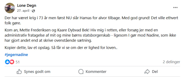 Facebook retfærdiggjorde Lone Degn Hamas’ massakre mod Israel: – Der har været krig i 73 år, men først nu slår Hamas for alvor tilbage. Med god grund! Det ville ethvert folk gøre, skrev hun.