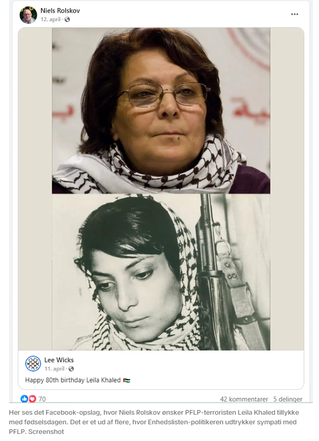 Niels Rolskov ønskede top terroristen Leila Khaled tillykke med fødselsdagen på Facebook. Khaled stod bag flere flykapringer og er fremtrædende medlem af terrorgruppen PFLP.